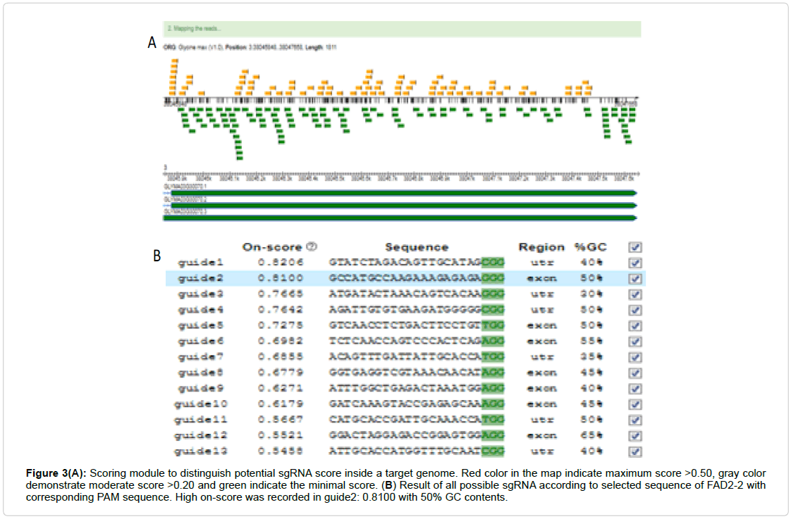 The standardized ECMA (European Computer Manufacturers Association) program Sequence Manipulation Suite (SMS) was optimized for filtering non-DNA symbols like dots and numbering from aligned sequence. Filtering with SMS is mandatory before synthesizing oligos for sgRNA because it can influence the sequence of final output of oligos for targeted results. To accomplish the potential sites for sgRNA within FAD2-2 sequence the filtered sequence is further subjected to CRISPR-P, before jumping to CRISPR P 2.0 readers must care about certain parameters which is extremely sensitive and can influence the route of our sgRNA.