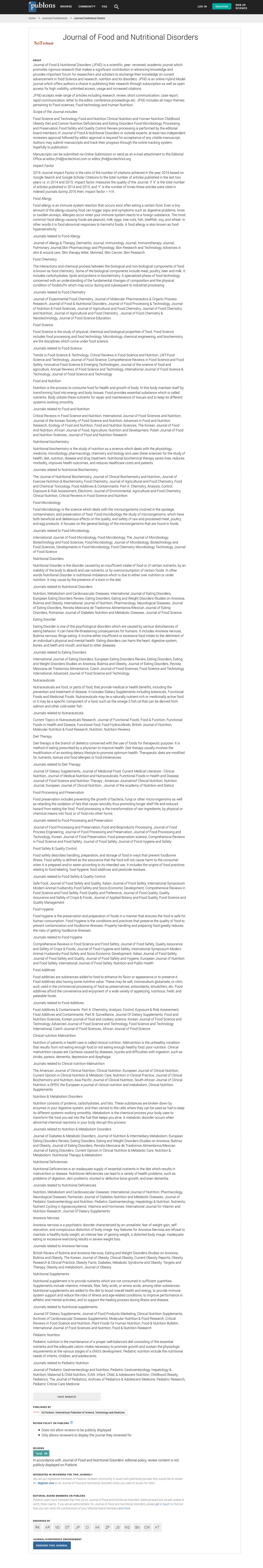 Journal of Food & Nutritional Disorders (JFND) is a scientific, peer -reviewed, academic journal which promotes rigorous research that makes a significant contribution in advancing knowledge and provides important forum for researchers and scholars to exchange their knowledge on current advancement in food Science and research, nutrition and its disorders. JFND is an online Hybrid Model journal which offers authors a choice in publishing their research through subscription as well as open access for high visibility, unlimited access, usage and increased citations.