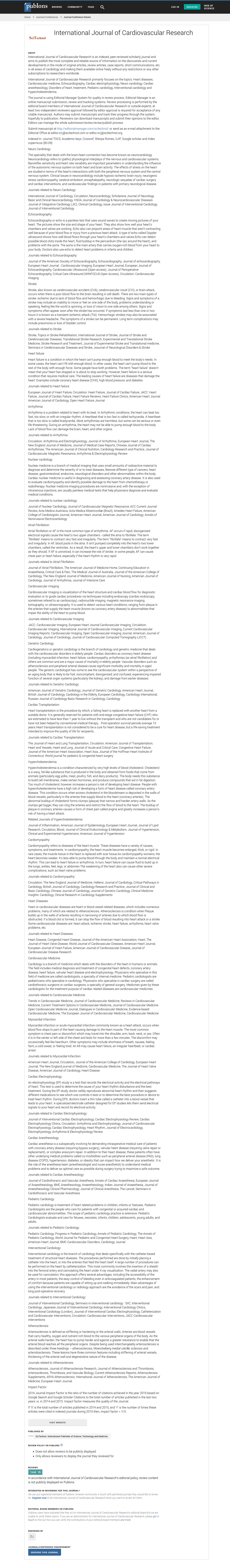 International Journal of Cardiovascular Research is an indexed, peer-reviewed scholarly journal and aims to publish the most complete and reliable source of information on the discoveries and current developments in the mode of original articles, review articles, case reports, short communications, etc. in all areas of cardiology and making them available online freely without any restrictions or any other subscriptions to researchers worldwide.
