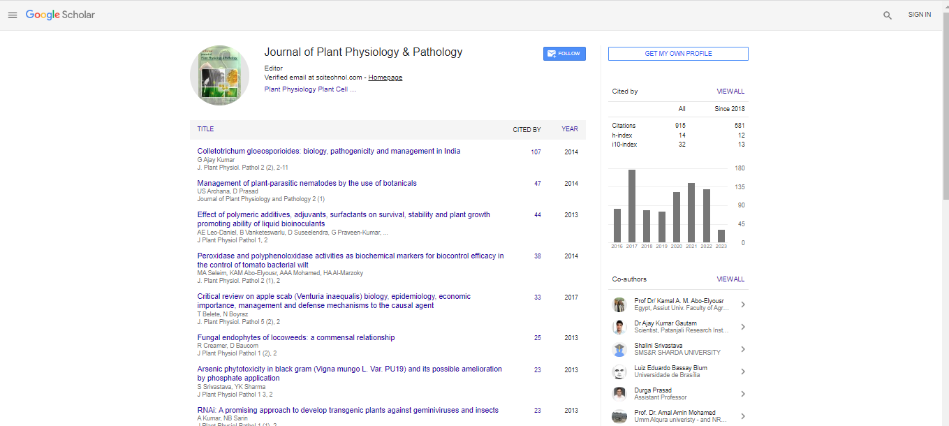 Journal of Plant Physiology & Pathology is a peer-reviewed scholarly journal and aims to publish the most complete and reliable source of information on the discoveries and current developments in the mode of original articles, review articles, case reports, short communications, etc. in all areas of plant physiology & pathology and making them accessible online freely without any restrictions or any other subscriptions to researchers worldwide.