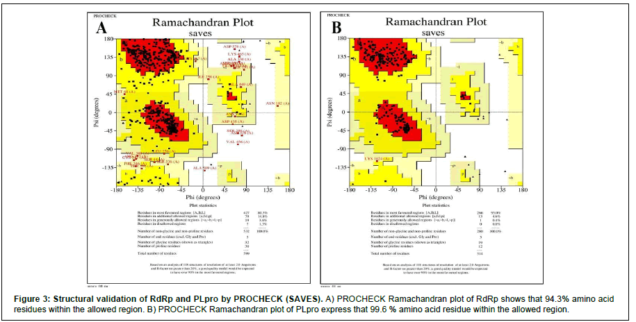 We performed protein modeling based on the homology modeling algorithm using the SWISS-MODEL database. First, we visualized the 3D model using.pdb format with PyMOL software (Figure 2). Then, the 3D structure was verified with PROCHECK, SAVES-Verify 3D, PROSA-Web, and Ramachandra Plotting. Helicase and PL protease have 85.57% and 89.14% residues (Table S1), respectively, in the favorable area. Whereas for RdRp, it is 83.72%. Ramachandran Plotting showed RdRp (Figure 3A), Helicase, and PLpro (Figure. 3B) have 95.1%, 99%, and 99.6% amino acids residues resided allowed region (Figure 3), respectively including 80.3%, 76.3%, and 95% in the most favored area. Finally, the PROSA-web service determined the overall stability of the protein 3D structure. All three showed stable structure, having Z values -8.9, -8.89, and -8.85 for RdRp (Figure. 2B), PL protease (Figure 2D), and Helicase (Figure 2F), respectively. RMSD (Root Mean Square Distance) values of these three protein models with their respective templates are 1.776 Å (RdRp), 1.640 Å (Helicase) and 0.822 Å (PLpro). RMSD values less than 2 Å are considered as validated structures. Physiochemical properties with charge are enlisted in Table 1.